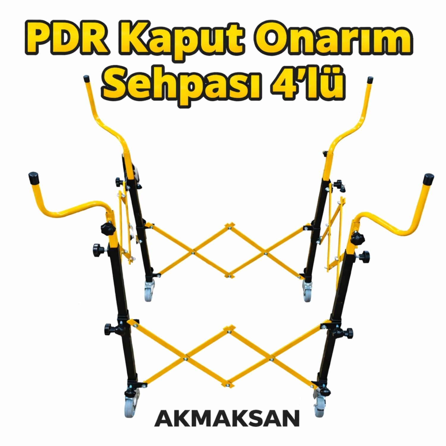 Boyasız göçük düzeltme (PDR) işlemleri sırasında kaputun sabit ve dengeli durmasını sağlayan, orta kısmı akordeon mekanizmalı, 4 kollu profesyonel PDR kaput sehpası.